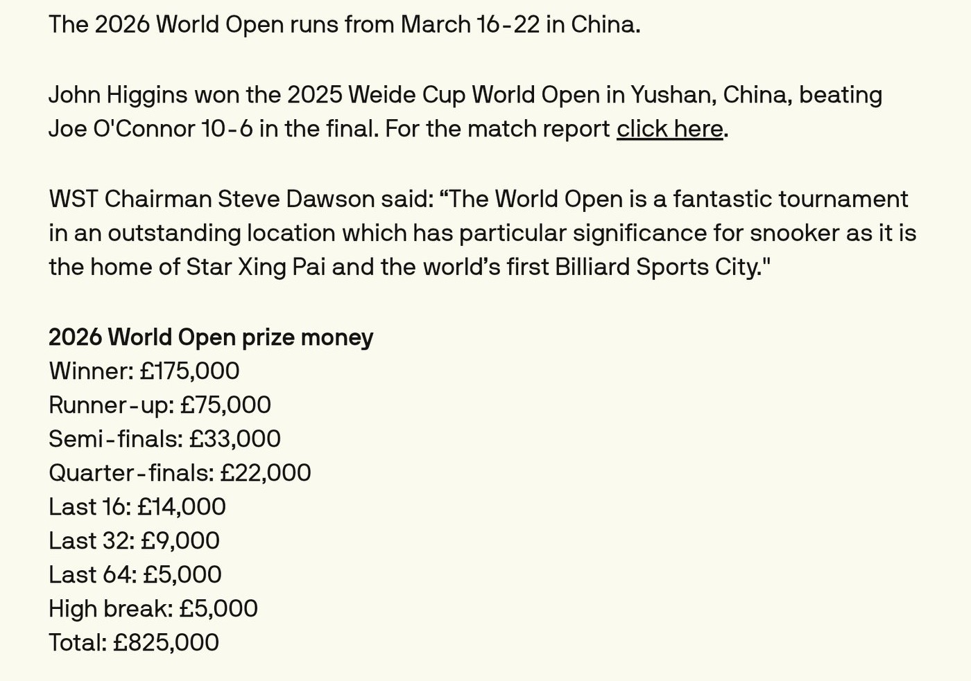 The defending champion is John Higgins, who defeated Joe O'Connor 10-6 in last year's final. This year's tournament is held in Yushan, Jiangxi, China.