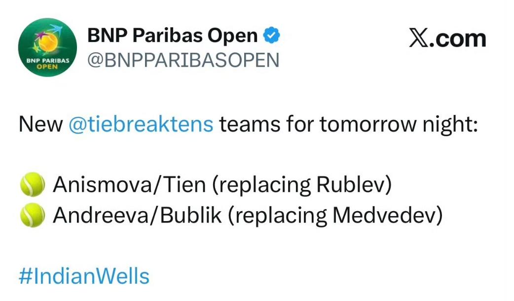 While everyone awaited updates on whether Medvedev and Rublev had left Dubai, Indian Wells officials announced the cancellation of their mixed doubles 'Tie Break Tens' exhibition spot, replaced by Lestienne and Bublik.