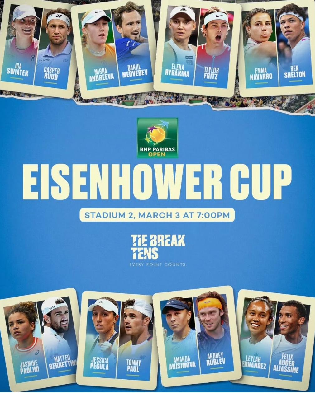 This pre-tournament exhibition featured a strong lineup: eight women—Swiatek, Andreeva, Rybakina, Pegula, Anisimova, Paolini, Navarro, and Fernandez—and eight men—Ruud, Medvedev, Rublev, Fritz, Shelton, Paul, Berrettini, and Aliassime.