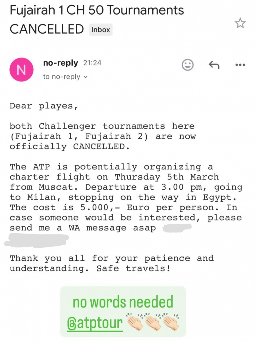 However, each player will have to pay 5,000 euros out of pocket to depart the UAE without any financial assistance from ATP. According to Portuguese press, ATP proposed arranging a flight from Muscat (Oman) to Milan (Italy), transiting through Egypt.