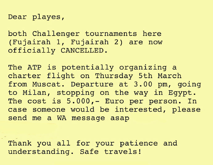 It is understood that to leave the dangerous area quickly, Medvedev and his companions paid tens of thousands of euros for the private charter. Their ability to afford this fee is also why they could evacuate early. Other players stranded in the UAE were not so fortunate; all players stuck at the Dubai event and the Fujairah Challenger were informed by the relevant tournament organizers that they could take a charter flight to Milan, Italy, on March 5, but each must pay 5,000 euros.