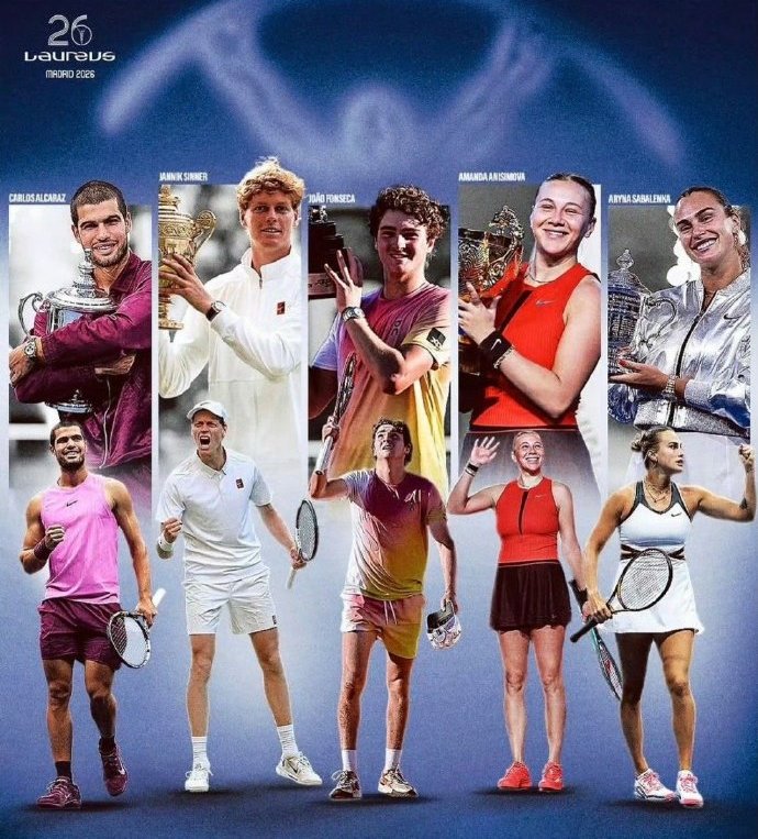 Let's turn to the Laureus World Sports Awards. Last night Beijing time, the 2026 Laureus Sports Awards officially announced the nominee lists for four categories. World Sportsman of the Year: Carlos Alcaraz, Jannik Sinner; World Sportswoman of the Year: Aryna Sabalenka; World Breakthrough of the Year: João Fonseca; World Comeback of the Year: Amanda Anisimova.