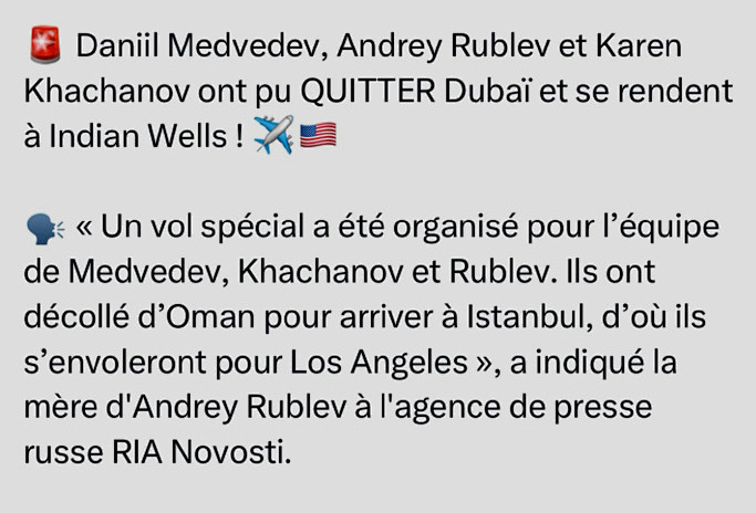 Early this morning Beijing time, a Russian news agency reported, citing Rublev's mother, that Medvedev, Rublev, and Khachanov have all left Dubai, UAE, transited through Oman, and fled the conflict zone via private jet. The report stated the Russian trio plans to fly first to Istanbul, Turkey, then transfer to Indian Wells, USA, to compete. Of course, they will miss the pre-tournament mixed doubles exhibition, and the event organizers have already replaced them, but being able to play the main draw singles is already a positive outcome.