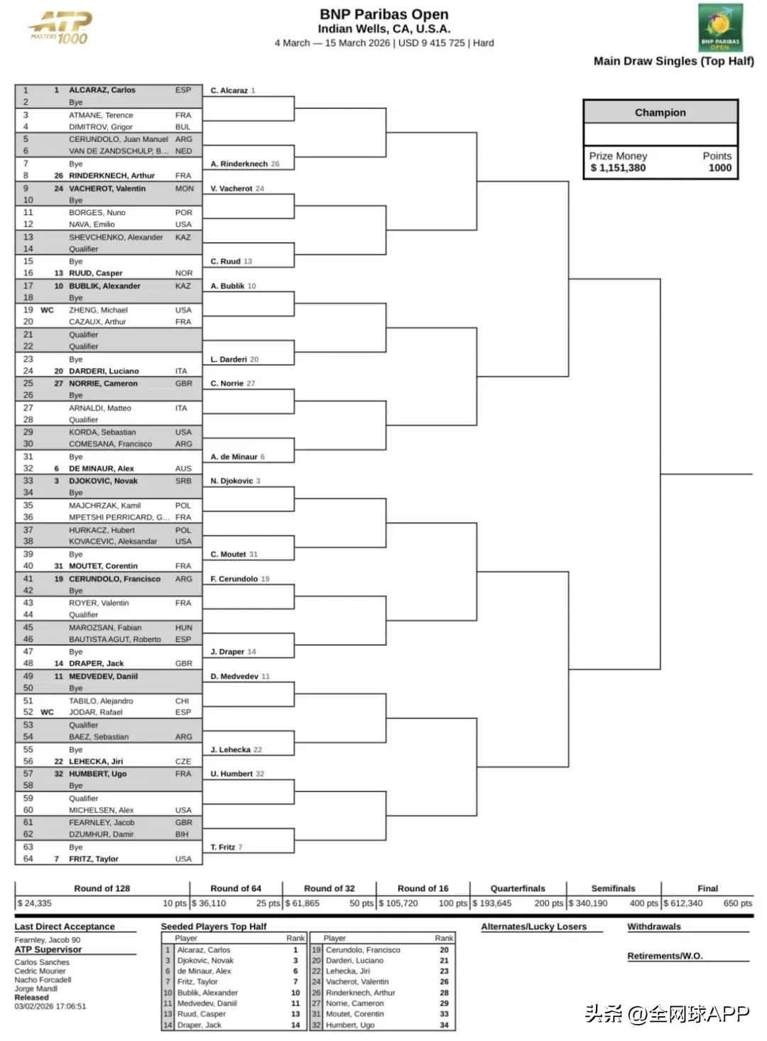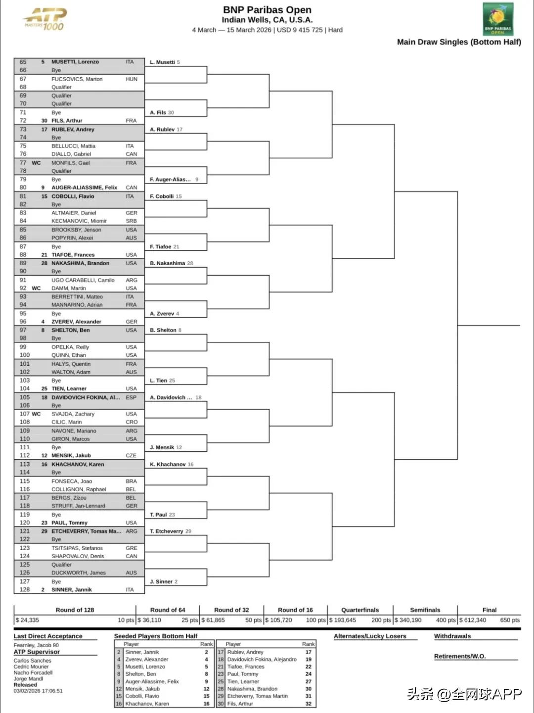 On the official page of the Indian Wells tournament, Medvedev and Khachanov have already booked practice courts for the 4th local time. Medvedev reached the semifinals here last year, losing to Rune, and faces significant points to defend this year. However, the long journey is undoubtedly a major drain. Fortunately, as the 11th seed, he has a first-round bye, giving him extra time to rest and recover. Rublev and Khachanov also enjoy first-round byes and will additionally partner in the doubles competition.