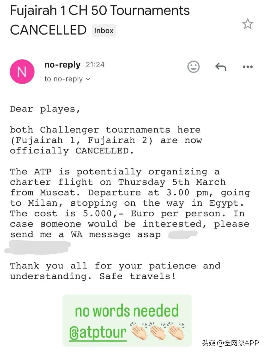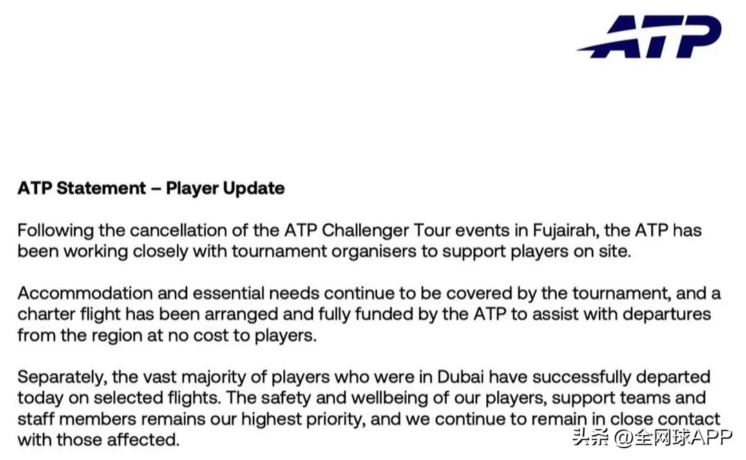 ATP subsequently issued an official statement, emphasizing its continued commitment to ensuring the safety of players and staff: "Following the cancellation of the Fujairah Challenge, ATP has worked closely with the tournament organizer to support players on site. The tournament continues to provide accommodation and essential living support, while ATP has arranged and fully funded a charter flight to help players leave the area at no cost. Additionally, the vast majority of players currently in Dubai have already successfully departed on designated flights today. The safety and well-being of players, support teams, and staff remain our top priority, and we will maintain close contact with those affected."