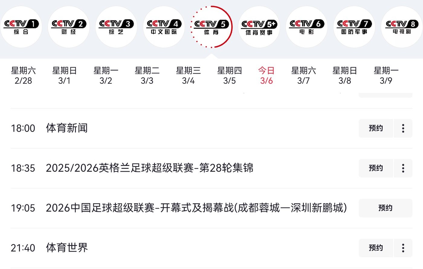 Today's Chinese Super League schedule (Mar 6, 2026): Chengdu Rongcheng vs Shenzhen Xinpengcheng, live on CCTV-5 and Migu Video.