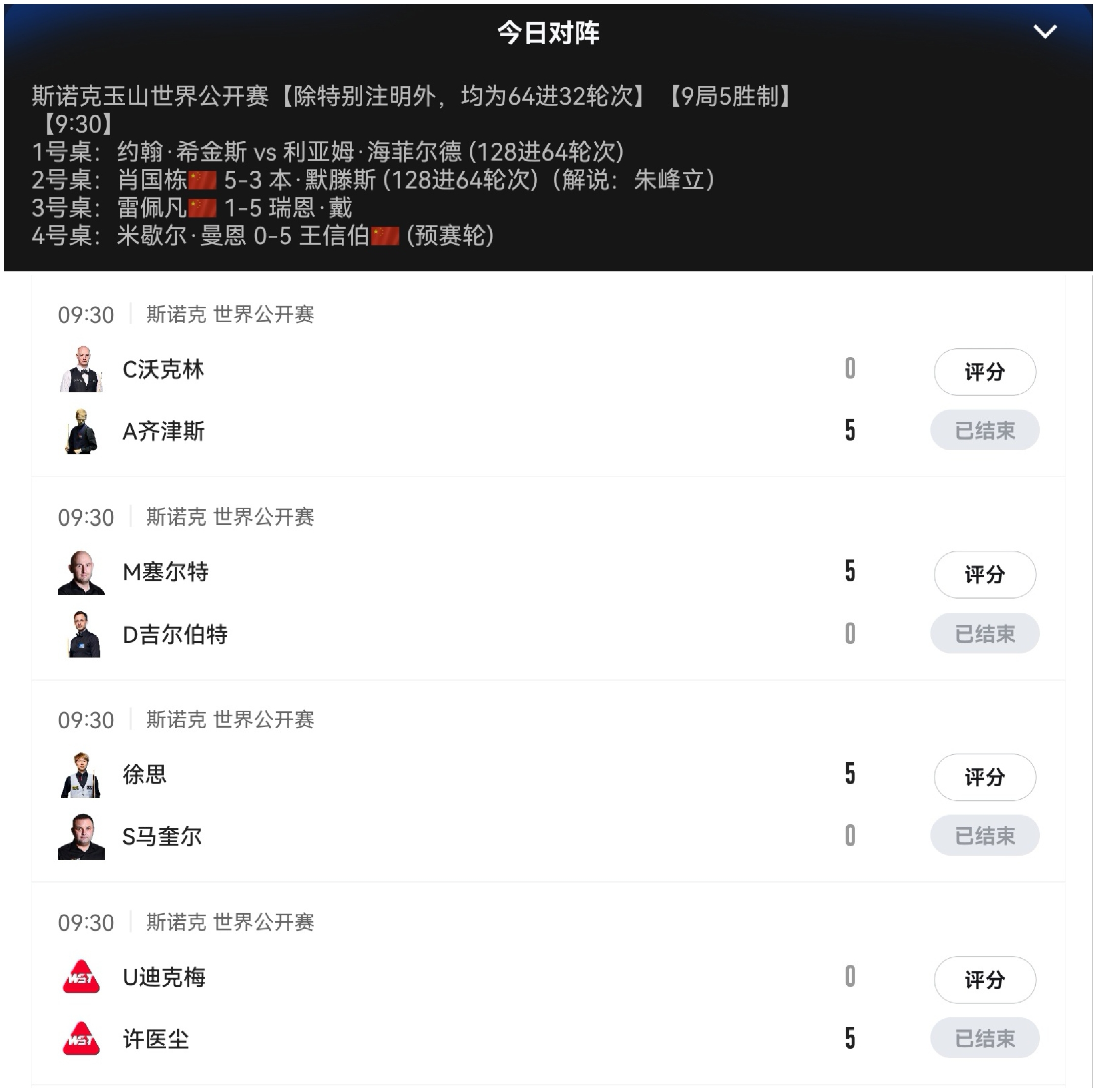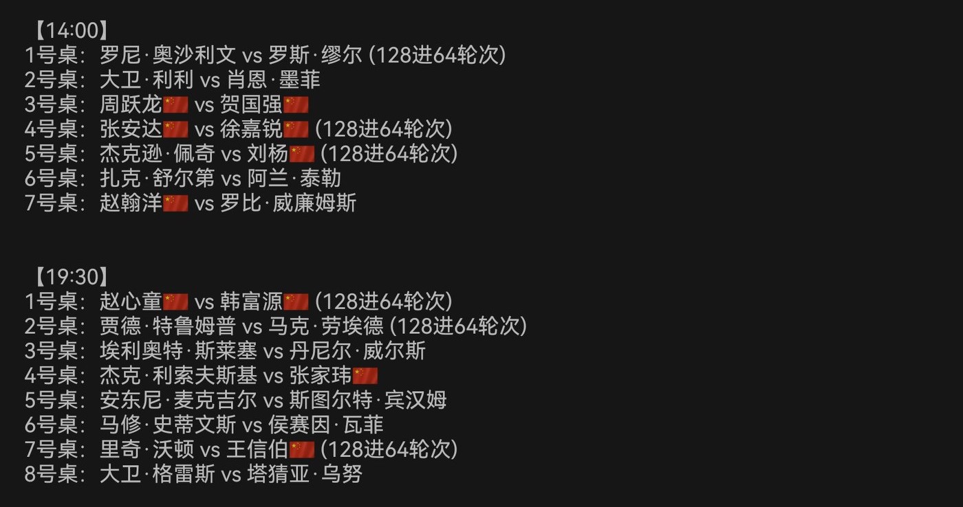 Attached is the schedule for this afternoon and evening. The Huya Live platform provides free live coverage throughout. CCTV Video offers free live broadcasts of matches on Table 1 and Table 2. CCTV-5 will begin broadcasting the match between O'Sullivan and Muir at 2:30 PM today. CCTV-5+ channel will start live coverage of the match between Zhao Xintong and Han Fuyuan at 7:30 PM tonight. Everyone is welcome to watch.