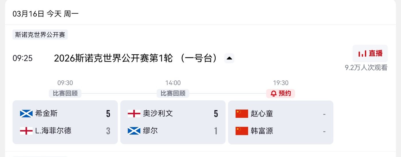 Latest news from the Snooker World Open: O'Sullivan qualifies for the 64-round with a 5-1 win against Muir. Also, tonight (2026.3.16) at 7:30, Zhao Xintong will play, broadcast on CCTV-5+ channel.
