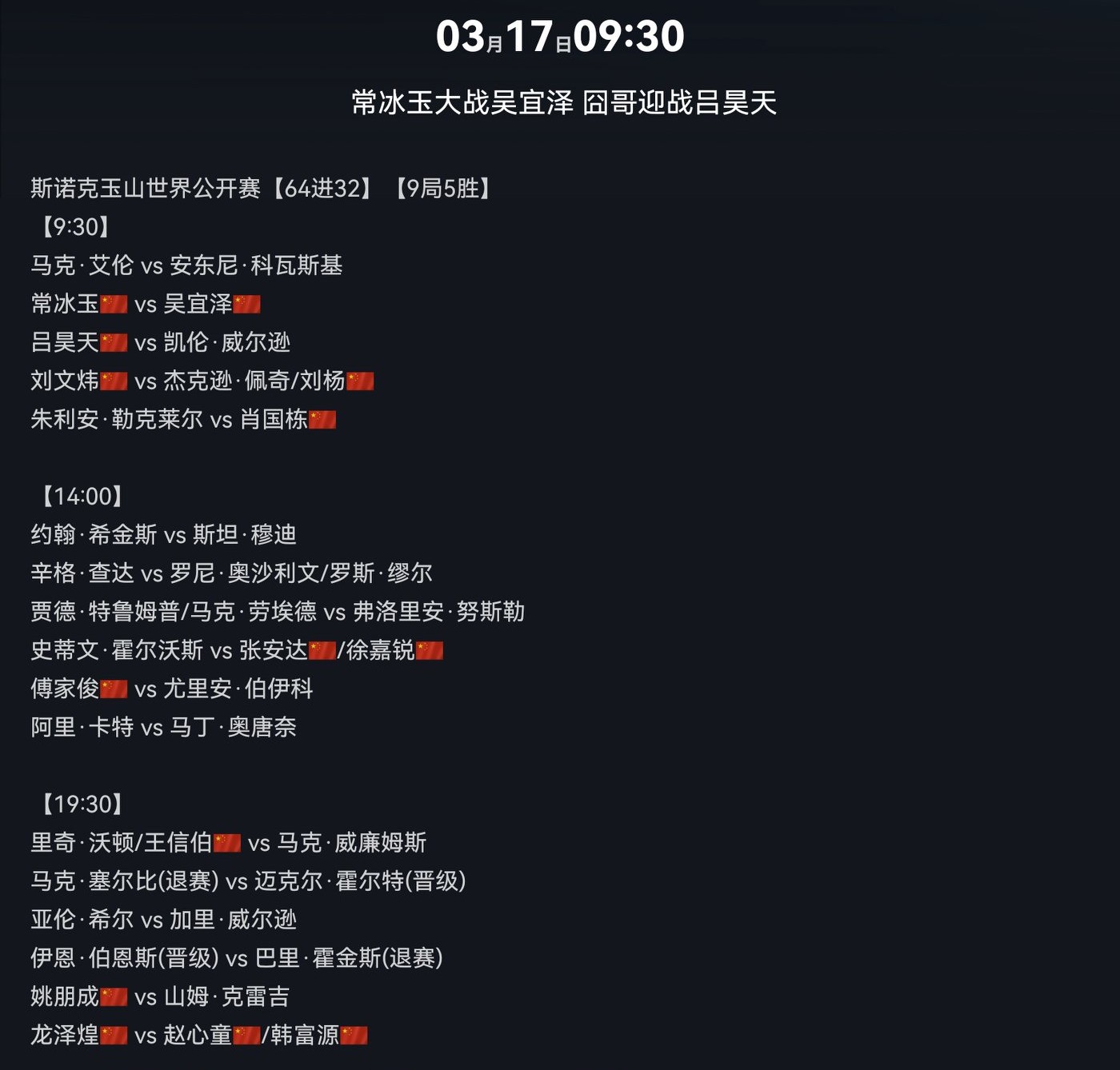Tomorrow is the Round of 64 to Round of 32 matches, using a best-of-9 frames format. The detailed schedule arrangement is shown in the image below.