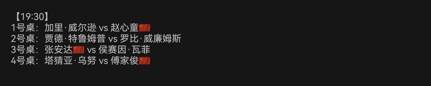 Tonight at 7:30 PM, Zhao Xintong, Zhang Anda, and Si Jiahui will compete. We hope they all win and advance to the quarter-finals. Particularly for Zhao Xintong, the match will be live-streamed on CCTV-5 starting at 8 PM tonight. Welcome everyone to watch.