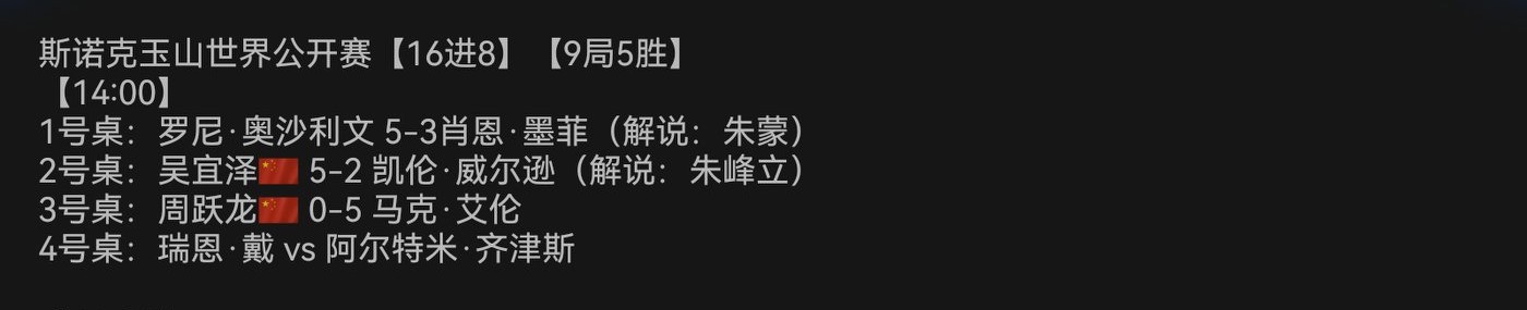 Latest Snooker World Open Tournament Report: In the three completed quarter-final matches, Wu Yize and Rocket O'Sullivan won and advanced to the quarter-finals, while Zhou Yuelong lost and was eliminated. Additionally, Zhao Xintong will compete tonight at 7:30 PM.