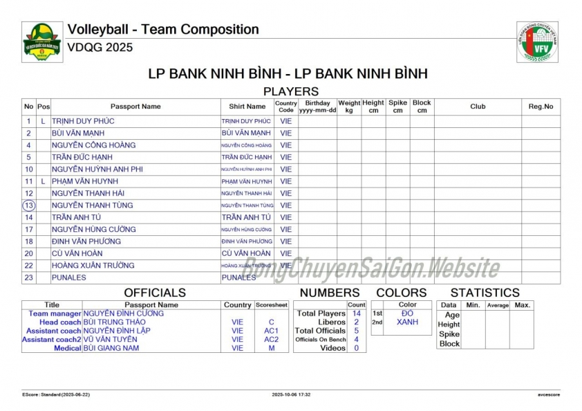 LPB Ninh Bình player list for the 2025 National Volleyball Championship