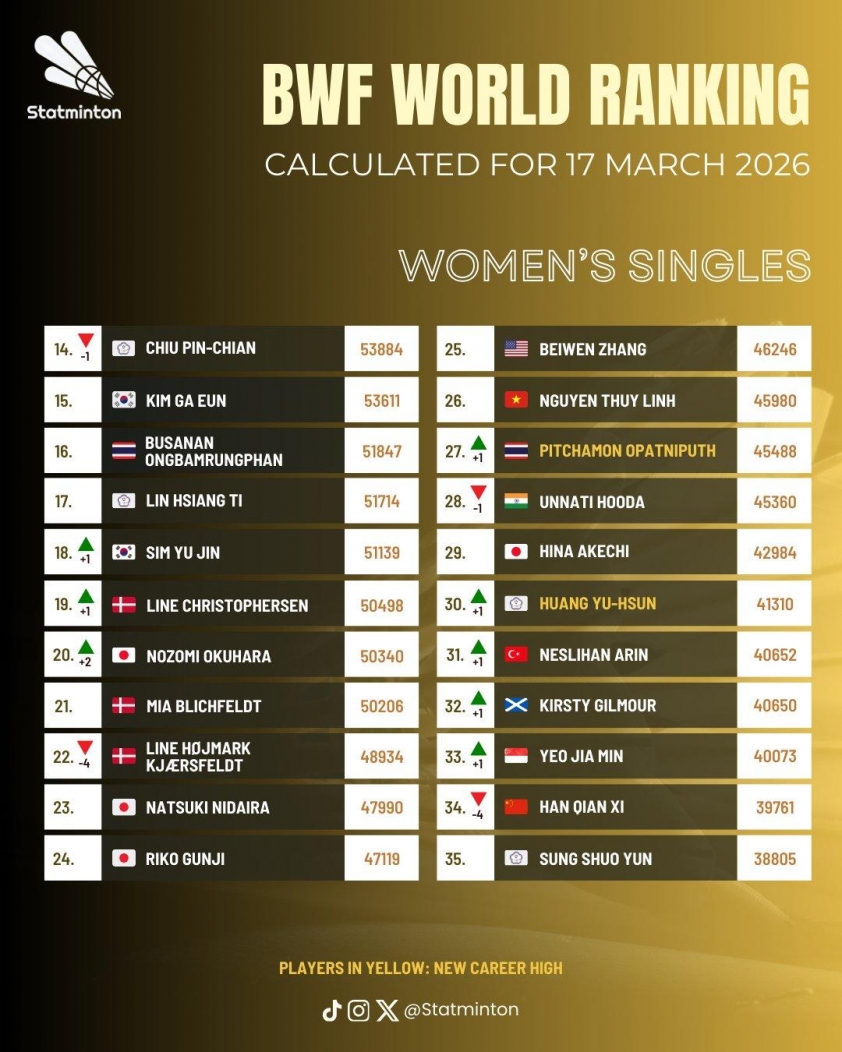 Pitchamon currently holds the 27th world ranking—just one spot behind Thuy Linh with a negligible point difference. The player born in 2007 moved up one rank compared to last week, pushing Unnati Hooda (India) down to the 28th position.