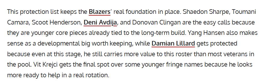 The US media analysis states: This protected list retains Portland's true core foundation. Sharpe, Kamara, Henderson, Avdija, and Clingan are unquestionable choices for protection, as they are the young core in the team's long-term rebuilding plan.