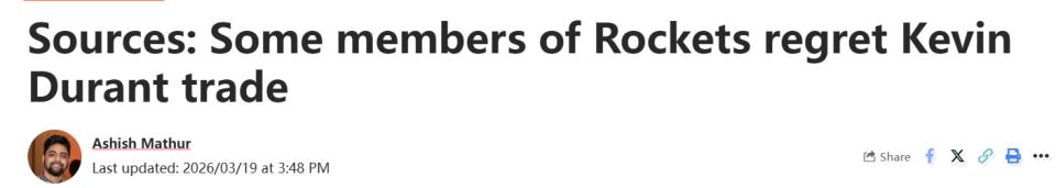 On March 20 Beijing time, according to US media Ahn Fire Digital, sources revealed that some members of the Houston Rockets regret the offseason trade to acquire Kevin Durant. The Rockets obtained Durant from the Suns through a massive seven-team trade involving the Nets, Warriors, Hawks, Lakers, and Timberwolves.