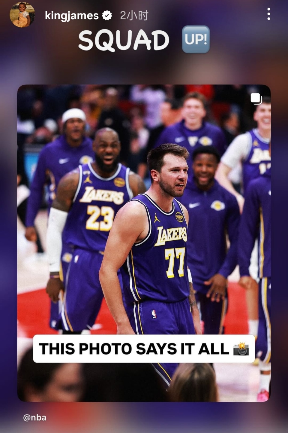 The second post was James praising the team's chemistry. He reposted an image from the NBA's official social media, with the original caption "This picture says everything," conveying the message of the Lakers' dual-core leadership and the team's high morale, also aligning with the team's hot streak of seven consecutive wins. James added his own note: SQUAD UP.