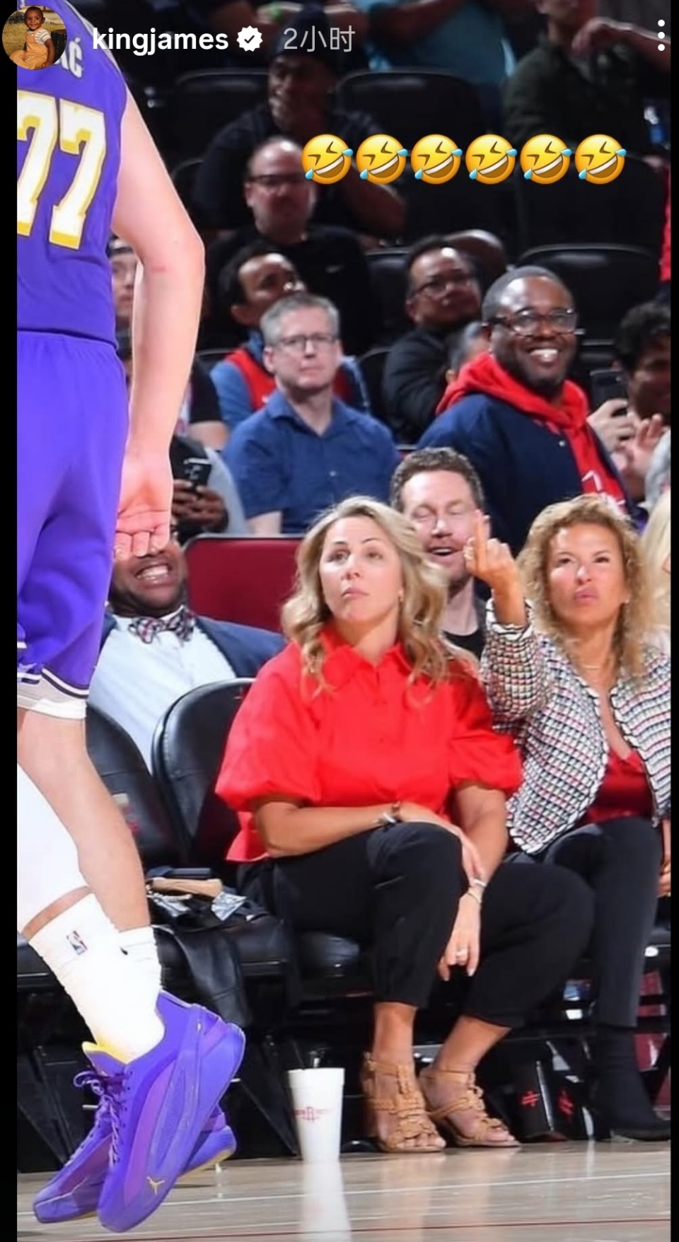 The third post was quite amusing, as he teased the interaction between Doncic and a fan. James posted six laughing-crying emojis, sharing the famous scene of a挑衅 fan giving Doncic the middle finger from the sidelines, humorously supporting his teammate and subtly connecting to Doncic's post-game mention of being fueled by fan trash talk.
