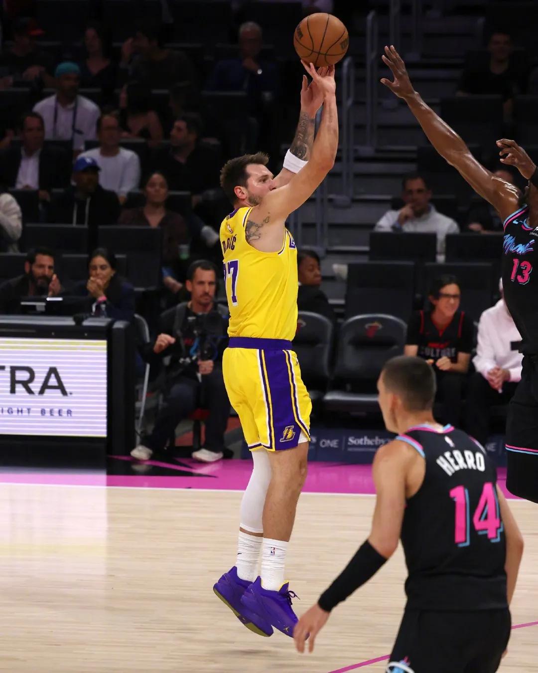 In the second quarter, the Lakers quickly adjusted, strengthening defensive coordination in the禁区, leaving the weak-side corner three-pointers of the Heat open. This quarter, the Heat made 2 out of 7 three-pointers, allowing the Lakers to recover some points. James maintained a 100% shooting rate with 5 out of 5 in the half, plus 3 assists. Doncic scored 21 points in the half, such a condition on a back-to-back is simply terrifying, and what's even more frightening is yet to come.