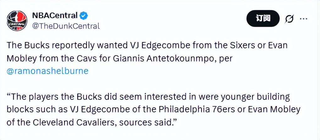 Additionally, Shelburne reported that the Bucks had interest in two rising stars during trade discussions involving Giannis. "The players the Bucks were interested in are younger cornerstone-type talents, such as the 76ers' Echim or the Cavaliers' Mobley."