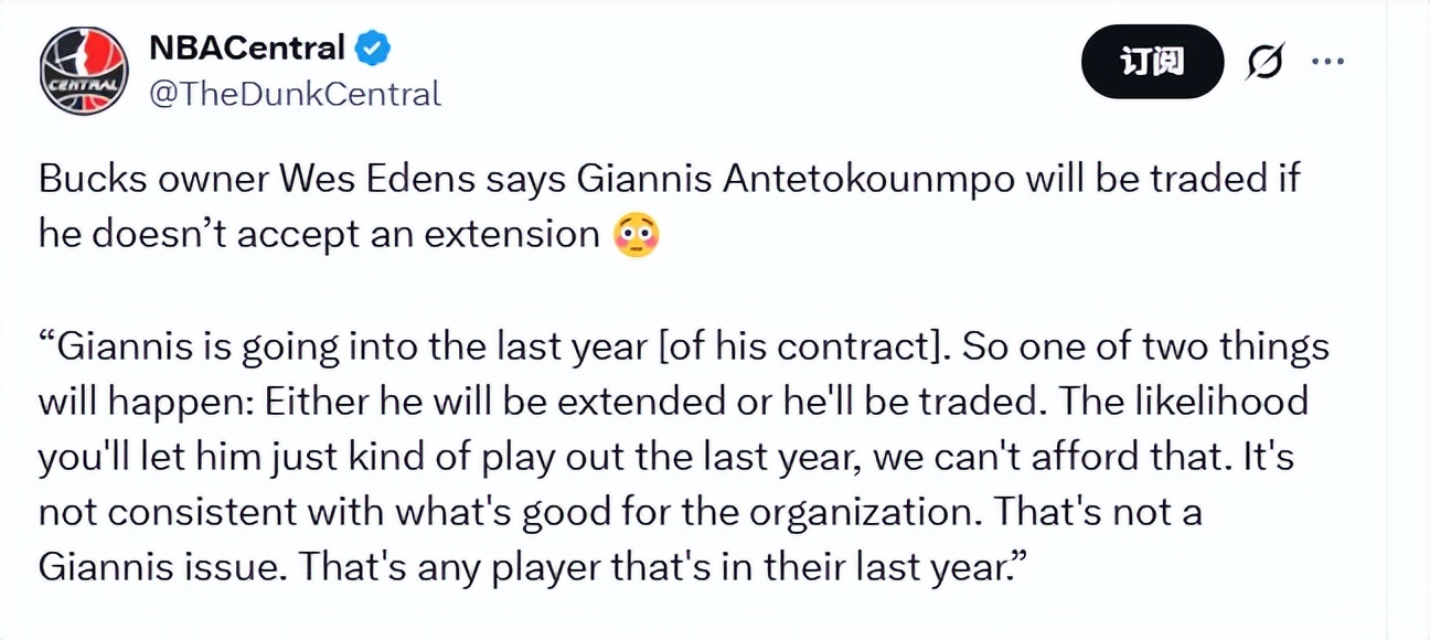 "Giannis is entering the final year of his contract," Edens stated. "So there will only be two outcomes: either extend or be traded."