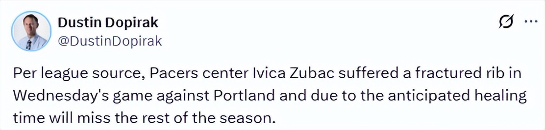 On March 20 Beijing time, according to Pacers reporter Dopirak, Pacers center Zubac suffered a rib fracture in Thursday's loss to the Trail Blazers and will miss all remaining games this season due to the injury.
