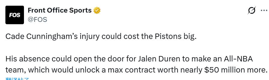 Sports medicine expert Stotts indicated: players with pneumothorax average 26 days off, roughly missing 10.8 games. If the absence is prolonged, Cunningham will not meet the attendance criteria. Media pointed out that if Cunningham misses All-NBA, it might benefit his teammate Duren.
