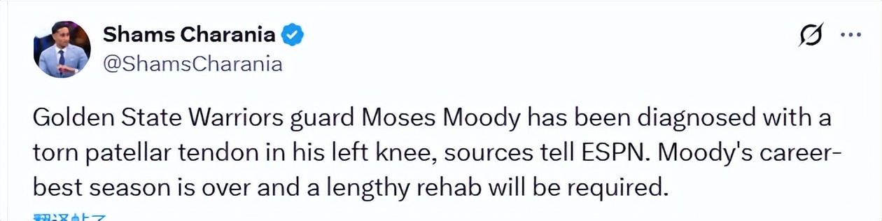 On March 25 Beijing time, as reported by noted journalist Shams citing ESPN sources, Golden State Warriors guard Moody has been confirmed to have a torn patellar tendon in his left knee. Moody's standout season has been cut short, necessitating an extended period of rehabilitation.