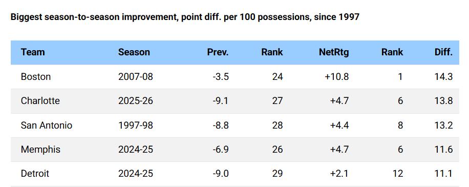 Before this victory, the Hornets' net rating per 100 possessions this season was still +4.7, ranking sixth in the league. Last season, their net rating per 100 possessions was -9.1, ranking fourth worst in the league. This 13.8-point improvement in net rating per 100 possessions is the second-largest single-season leap in the 30 years since detailed per-possession statistics were tracked in the NBA, only behind the 2007-08 Celtics (14.3-point improvement).