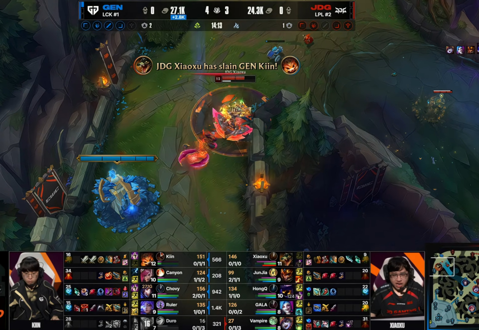 Because the mid lane was constantly under pressure, Canyon played more flexibly in the jungle, while Junjia became more passive. Of course, the biggest gap in this match was in the bot lane. Whether Gala and V chose any champion, they seemed unable to pressure Ruler and instead frequently got caught out! Overall, JDG looked like a child against GEN, reminiscent of the old days when LPL faced LCK—without lane priority, everything was controlled by GEN, and whether in team fights or resource contests, they were always half a step behind! Fortunately, as an international newcomer, Xiaoxu managed to reclaim some pride by solo-killing Kiin!