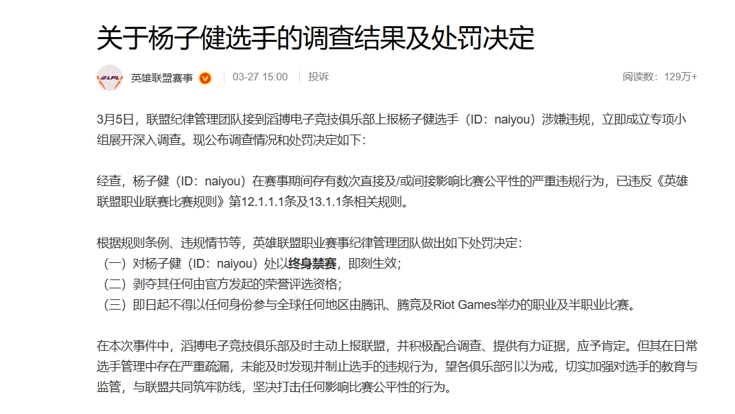 The second stage of the LPL is scheduled to start in one week. The official organization recently released the penalty decision for TES jungler Cream. The investigation revealed that during the event, Cream repeatedly engaged in match-fixing activities that directly or indirectly affected match fairness. In other words, since joining the LPL league, he has publicly participated in match-fixing multiple times and, similar to Galaxy, supplied match intelligence to match-fixing syndicates, including training session BP details.