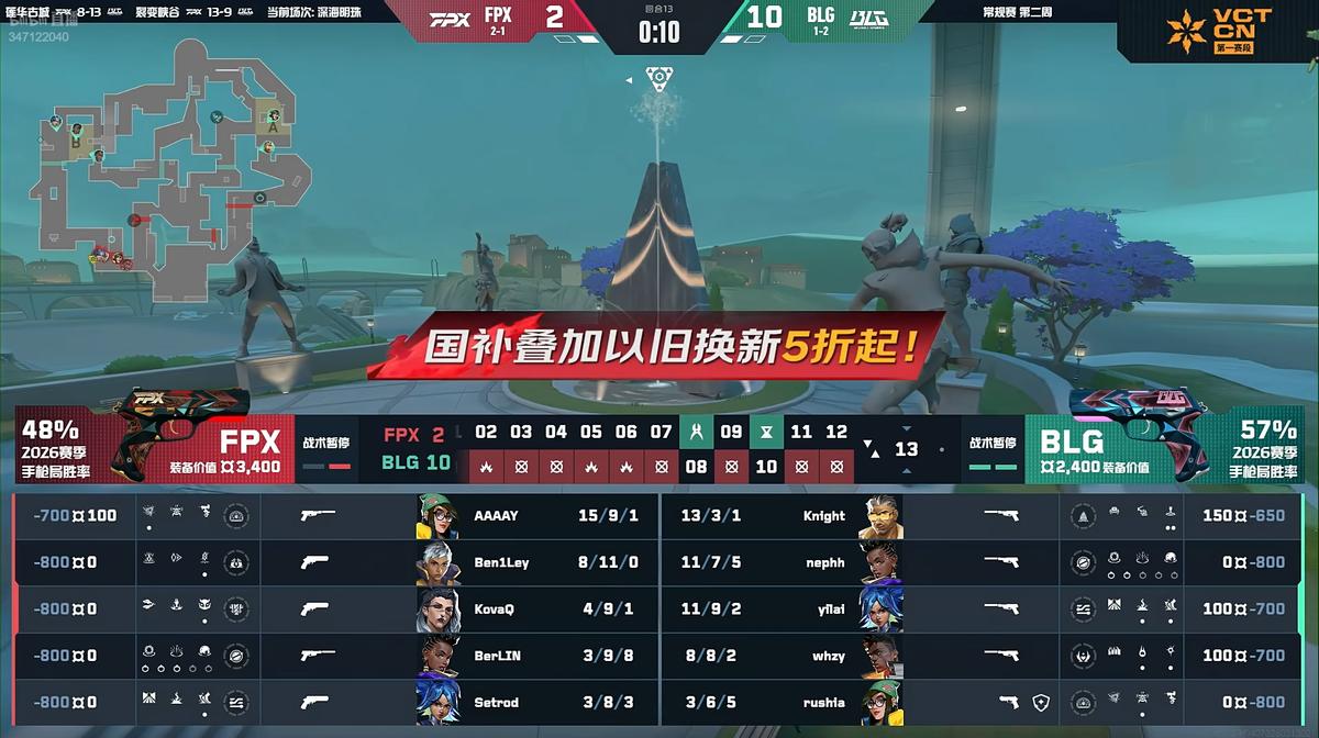 In the final round of the first half, Knight won the post-plant situation, bringing the score to BLG 10-2 FPX.