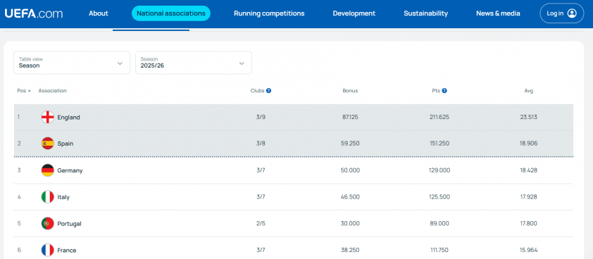 Having 5 teams directly entering the Champions League Round of 16 helped England accumulate a large amount of bonus points. Newcastle also contributed significantly by ranking 12th and defeating Qarabag in both legs.