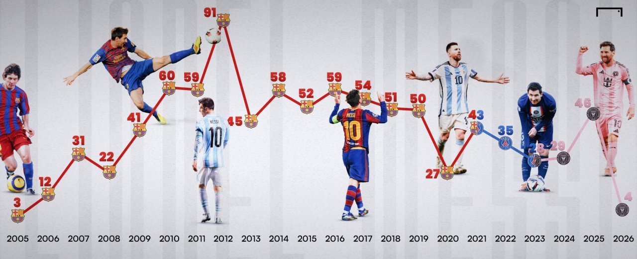 Messi's annual goal tally throughout his career; the 91 goals in 2012 might be an unparalleled, miraculous record in football history. With 900 goals achieved, is 1000 goals far away? Perhaps Messi does not focus on the "thousand-goal" milestone; what he values most is Argentina's performance in the 2026 World Cup hosted by the United States, Canada, and Mexico. As a football legend, scoring goals for Messi seems natural and effortless, not requiring excessive attention. Messi plays a team-oriented style; currently, his strongest skills are creating opportunities through precise passes and scoring from free kicks!