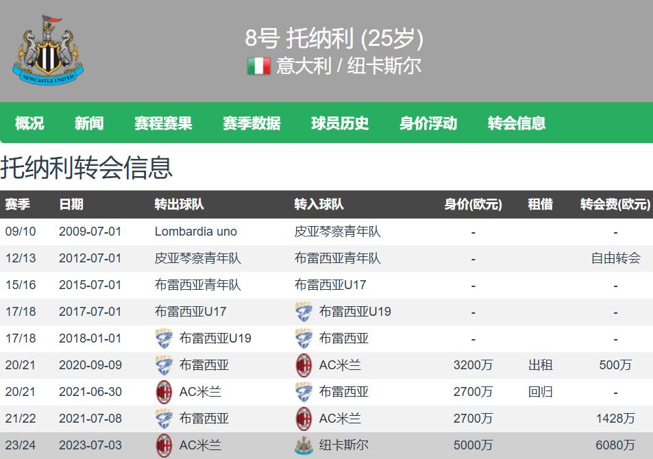 Tonali began his career at Brescia's youth academy. In the summer of 2021, he transferred from Brescia to AC Milan for €14.28 million. Then, in the summer of 2023, he moved to Newcastle in the Premier League for €60.8 million. So far, he has played 104 matches for the Magpies across all competitions, scoring 10 goals and providing 10 assists. Last season, as a key player, he helped the team win the League Cup.