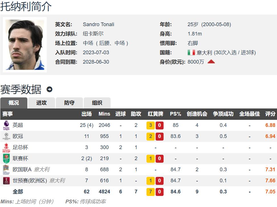 The 25-year-old Tonali stands 1.81 meters tall and is a right-footed player capable of playing as a defensive midfielder or central midfielder. His current market value is estimated at €80 million according to Transfermarkt, and his contract with Newcastle runs until 2028. This season, Tonali has made 47 appearances for Newcastle in various competitions, contributing 3 goals and 7 assists.