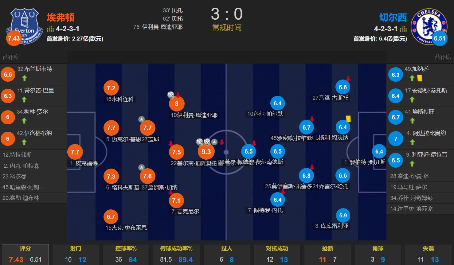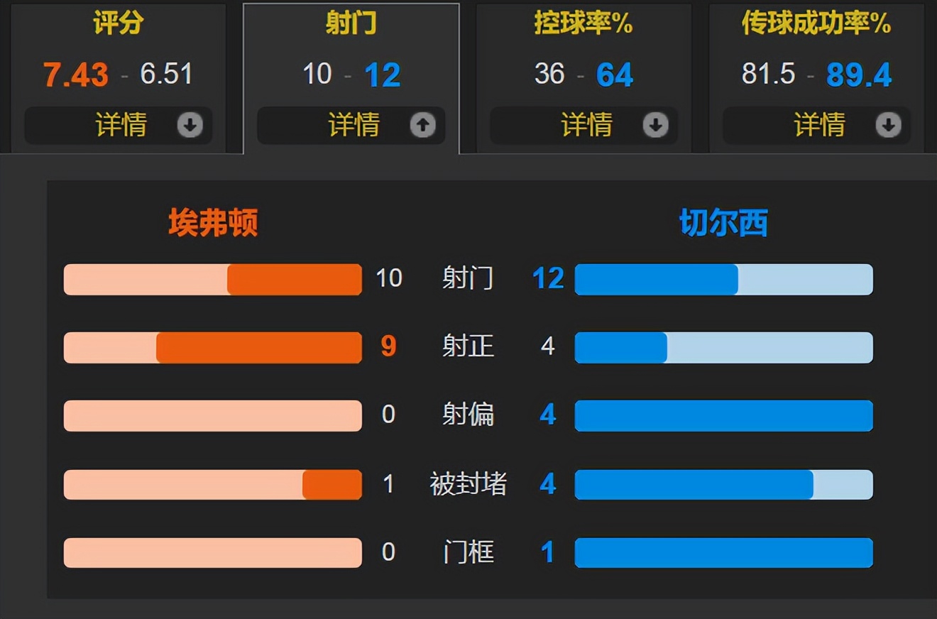 Throughout the match,Chelsea had a possession rate as high as 64%, with 12 total shots, 4 of which were on target; Everton had 10 total shots, with an exceptionally high 9 on target, scoring 3 goals.The efficiency was extremely high.