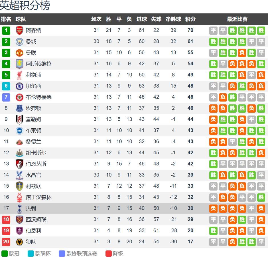 There are 20 teams in the Premier League, with a season comprising 38 matches. After 31 rounds played, Tottenham has 7 wins, 9 draws, and 15 losses, accumulating 30 points and ranking fourth from bottom, only 1 point above the relegation zone. With 7 rounds remaining this season and Tottenham already eliminated from all three cup competitions, their final 7 league matches will be a single-line battle for survival. Tottenham's main relegation rivals are West Ham United, who are 1 point behind, and Nottingham Forest, who are 2 points ahead.