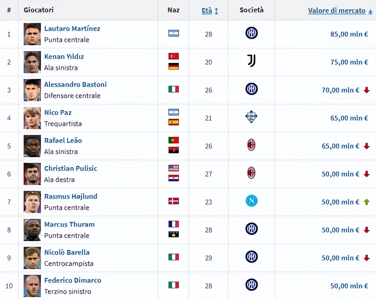 Home>soccerNews> Transfermarkt updates Serie A valuations: Still no €100 million player, Lautaro ranks first, Manchester United discard ranks sixth. >