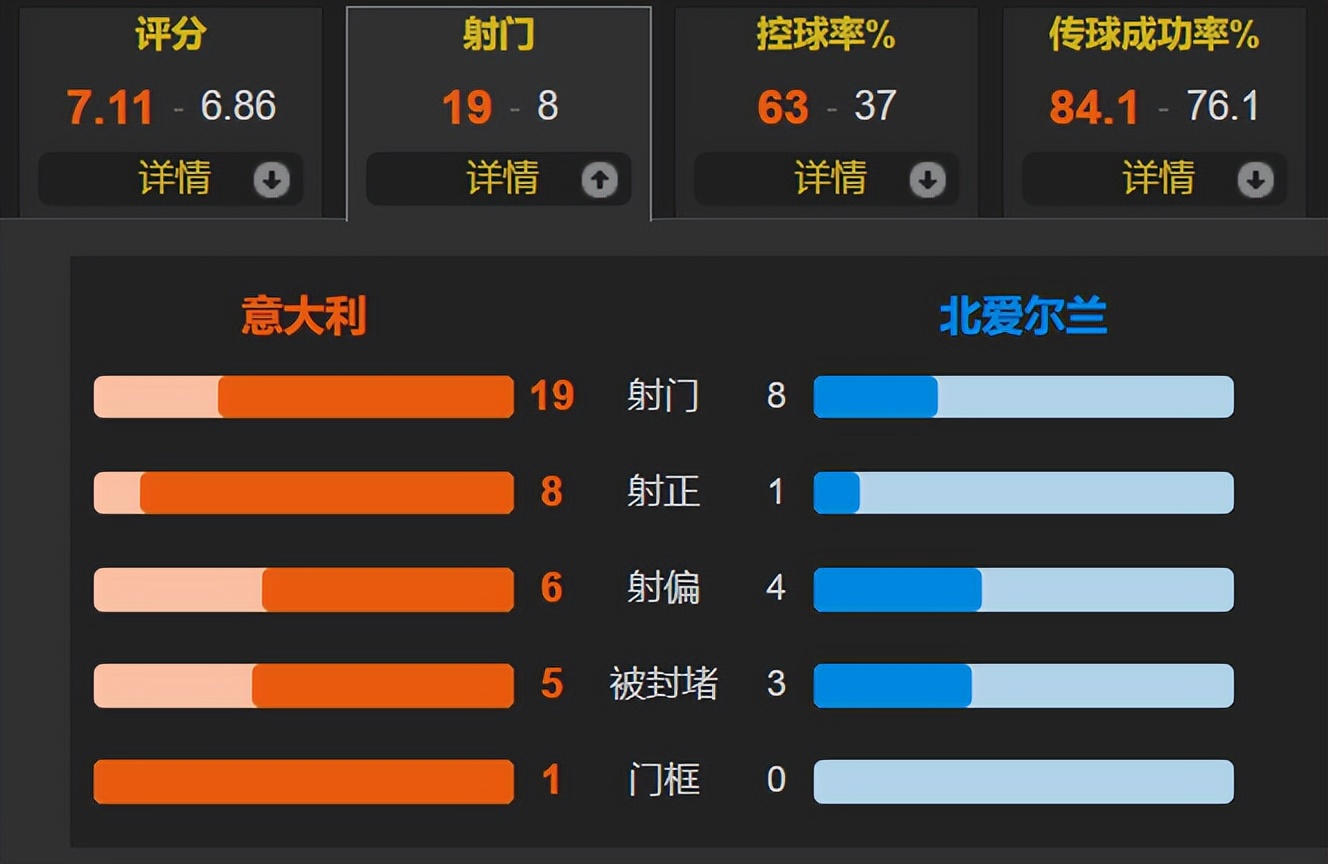 Throughout the entire match,Italy had 63% possession, with 19 total shots, 8 of which were on target; Northern Ireland had 8 total shots, with only 1 on target.Italy's forward line still lacks sharpness; Retegui is a naturalized Argentine striker who won an Serie A Golden Boot once before moving to the Saudi league for money. Italy's current football goal is simply to participate in the World Cup.