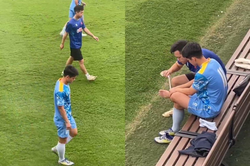 Specifically, during the morning training on March 27, Van Khang had to leave the field with the team doctor. Recorded images show the player, who is under contract with The Cong Viettel, sitting in the bench area while the doctor examined his left ankle. Although there is no official conclusion yet regarding the severity of the injury, this situation clearly causes concern for the coaching staff as the match against Malaysia is approaching very soon.