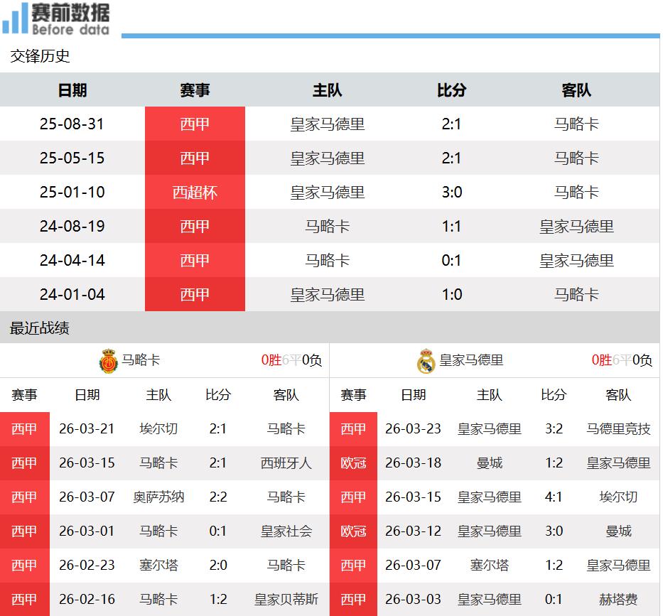 First:The situation of both teams! After 29 rounds of La Liga, Mallorca has 7 wins, 7 draws, and 15 losses, accumulating 28 points and ranking third from bottom, trailing the 17th place by 1 point, deeply entrenched in the relegation zone; Real Madrid has 22 wins, 3 draws, and 4 losses, accumulating 69 points and ranking second, trailing the top team Barcelona by 4 points.