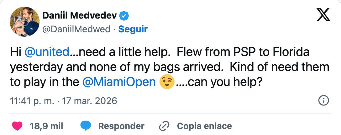 The 30-year-old player posted on social platform X, directly addressing the airline to resolve the issue quickly: "Hello @United... need a little help. Yesterday flying from Palm Springs International Airport to Florida, none of my bags arrived. I need these bags for the @MiamiOpen... can you assist?"