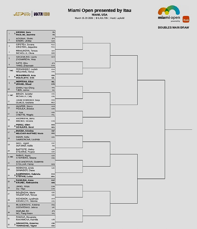 Additionally, the WTA 1000 Miami doubles draw was released early this morning Beijing time. For Chinese players, five golden flowers with four pairs are competing, first-round matchups are as follows: Zhang Shuai/Mertens vs Chan Hao-ching/Zeng Li-mei, Jiang Xinyu/Xu Yifan vs Danilina/Krunić, Yang Zhaoxuan/Kato Miu vs Siegemund/Zvonareva.
