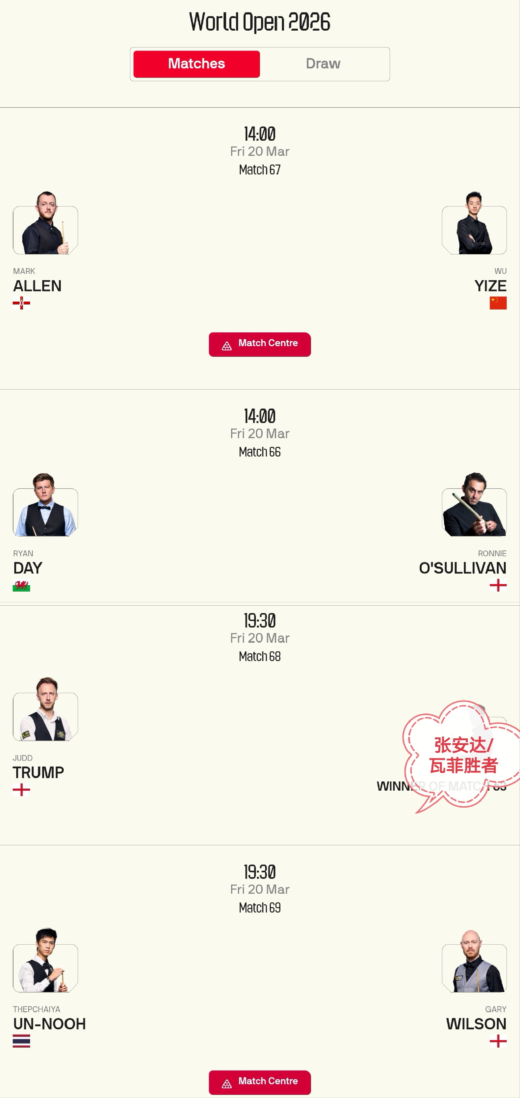 Snooker World Open Tournament schedule for tomorrow (March 20, 2026): Wu Yize, Ronnie O'Sullivan, Judd Trump, among others, will compete. Live broadcast on CCTV-5 and Yangshipin.