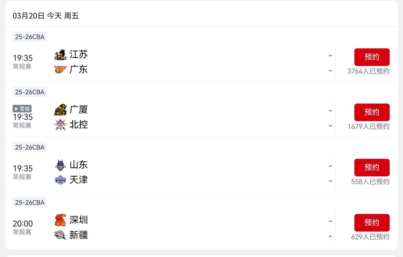 According to the schedule released by the organizing committee, four CBA games are scheduled today, details as shown in the image below.