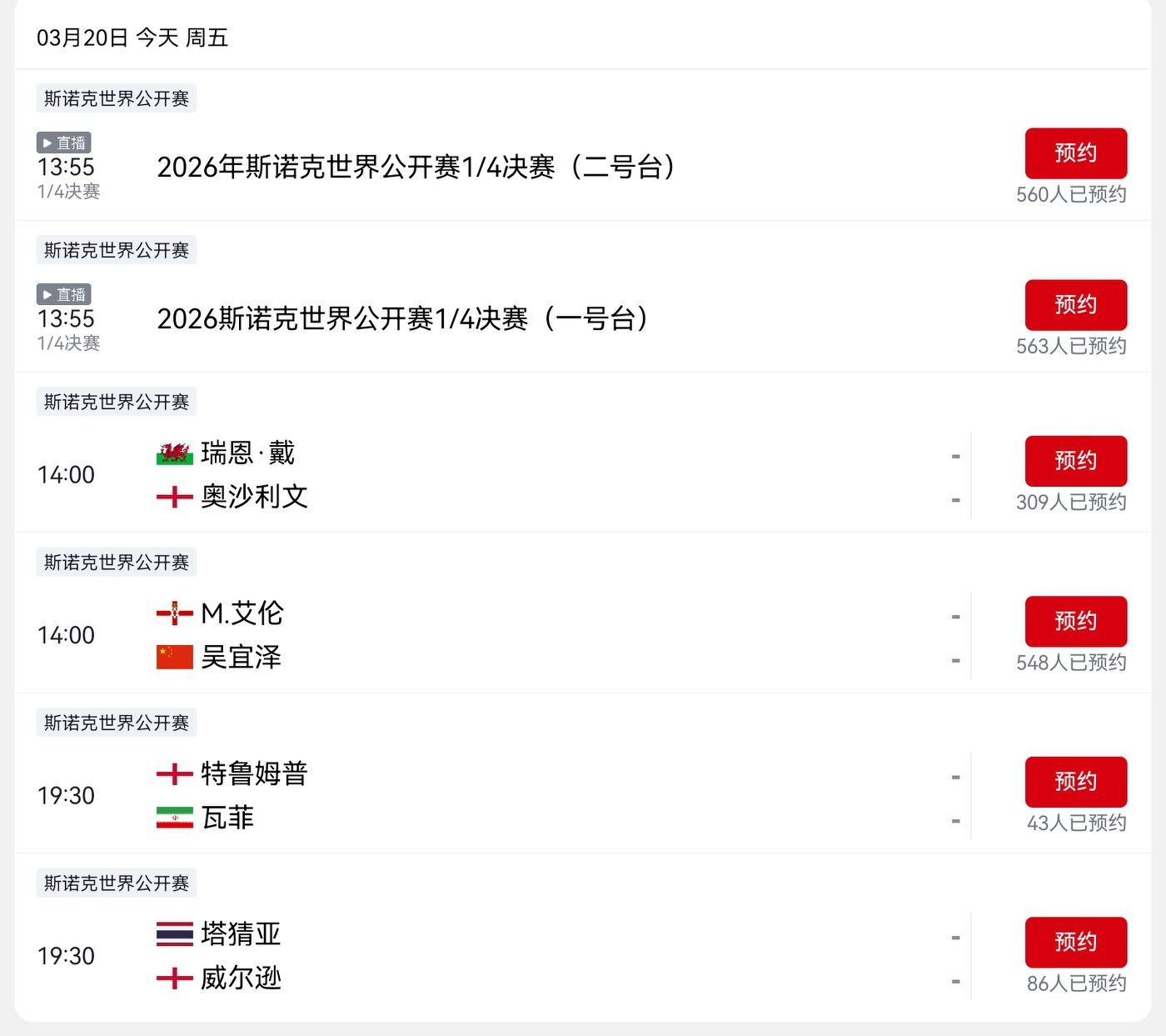 Snooker World Open Tournament schedule for today (March 20, 2026): Wu Yize, Ronnie O'Sullivan, and others are competing, live on CCTV-5.