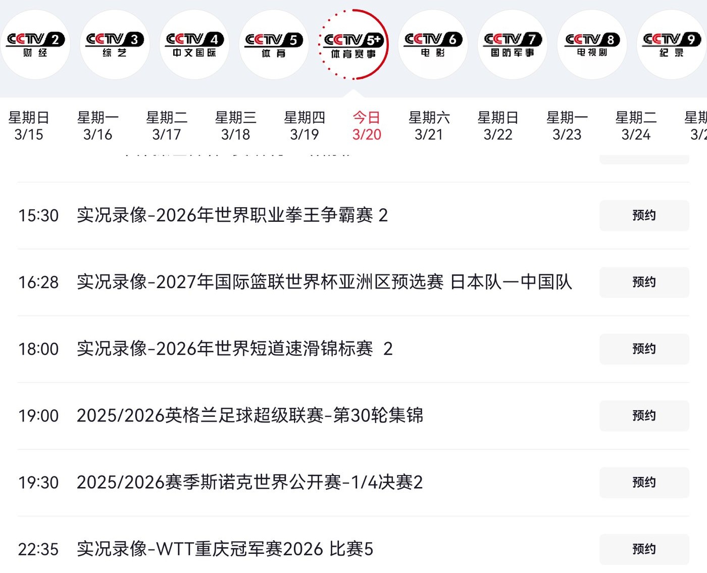 The live broadcast plan details for CCTV-5 and the CCTV Video platform are shown in the image below.