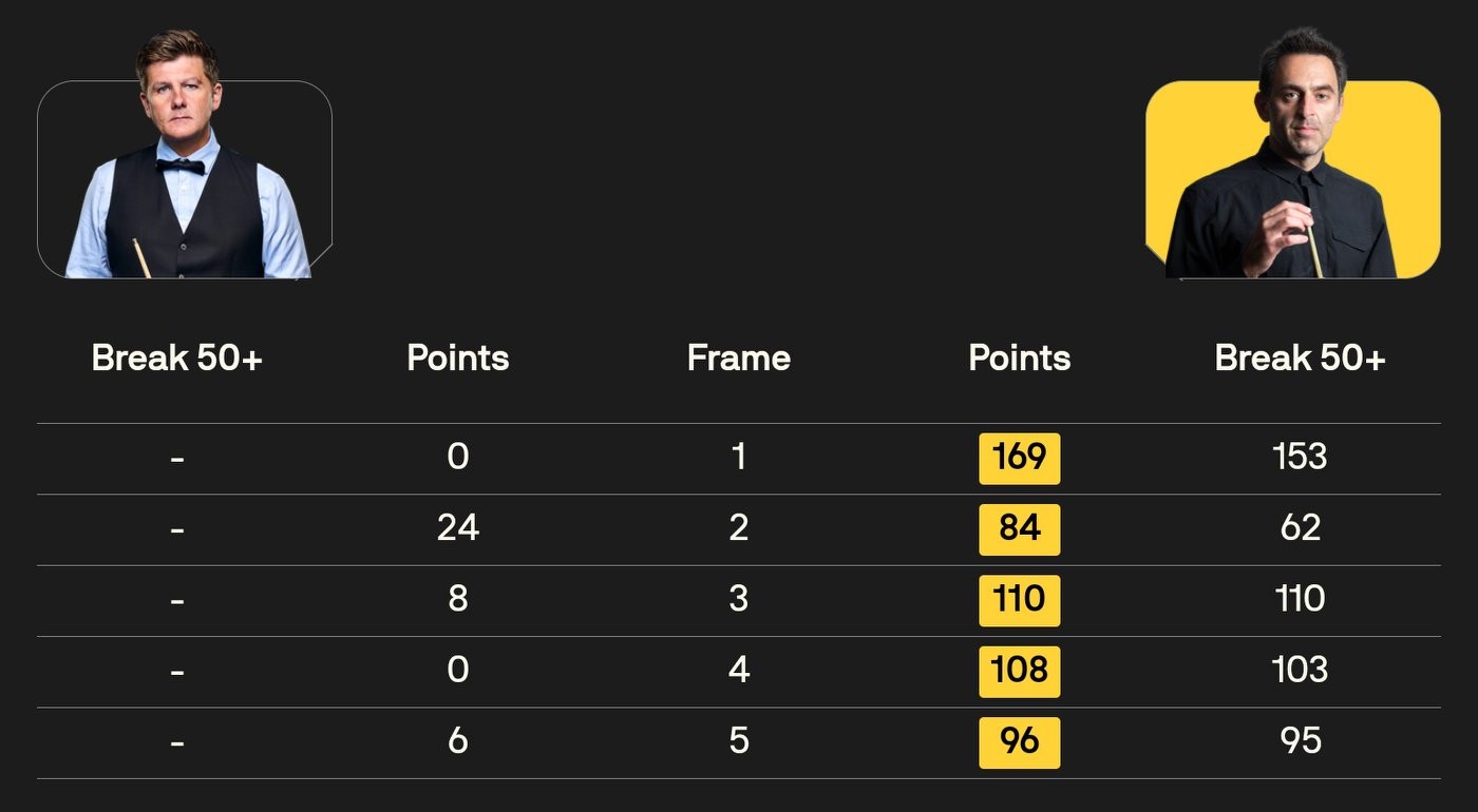 3. Even more impressive today was Ronnie O'Sullivan,不愧 being "The Rocket." In the first frame, he scored a total of 169 points with a single-break of 153, breaking the 147 maximum barrier. He achieved three century breaks, showcasing explosive performance. Therefore, shutting out Ryan Day 5-0 was a logical outcome.