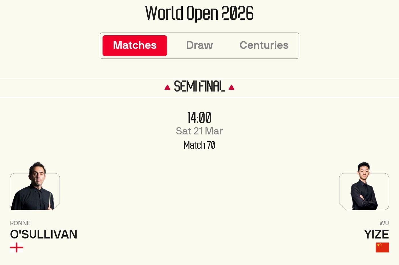 First, congratulations to Wu Yize for winning and advancing to the semifinals. However, it will be highly challenging as Wu Yize faces Ronnie O'Sullivan in tomorrow's semifinal.