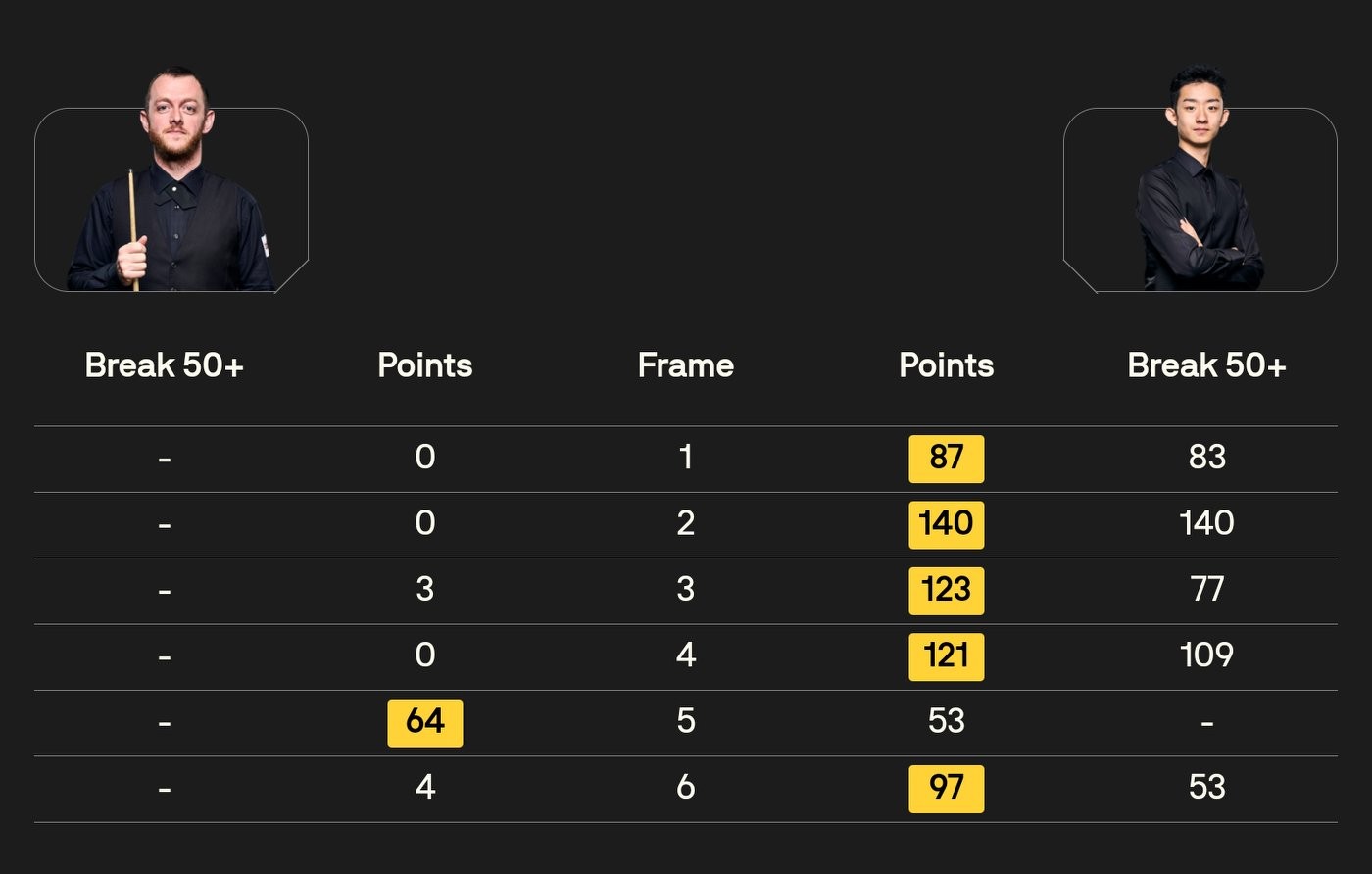 Wu Yize performed exceptionally well today. Despite not being favored before the match, he led Mark Allen 4-0 after four consecutive frames. Then each player won one frame, resulting in Wu Yize defeating Mark Allen 5-1. The statistics show Wu Yize had two centuries (100+ points) and three half-centuries (50+ points), demonstrating his strong attacking power.